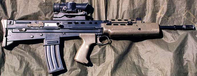 Britain started a programme to find a family of related weapons to replace the L1A1 battle rifle and the Bren gun titled "Small Arms for the 1980s" or SA80. The L85 is designed for the 5.56 x 45 mm NATO cartridge. The gas operated action has a short stroke gas piston, located above the barrel with its own return spring. The gas system has a three position gas regulator, one position for a normal firing, second for a firing in adverse conditions, and the third for launching rifle grenades (gas port is shut off).